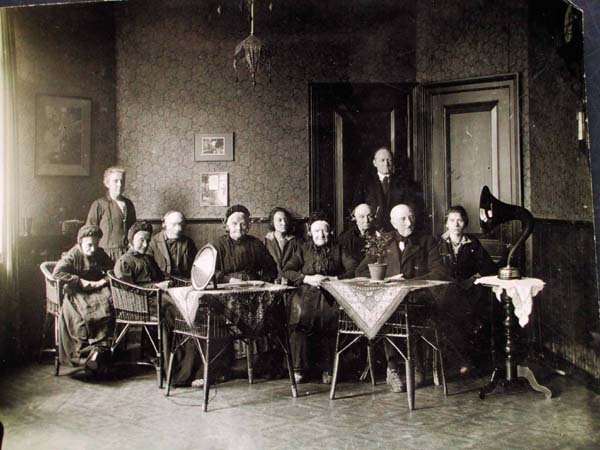 | In een rusthuis luistert een groep ouden van dagen naar de kerktelefoon. De foto dateert uit 1925. Rechts op de tafel een hoorn waar het geluid uit komt, op de linkertafel rust een aparte luidspreker. Enkele dames in het midden van de foto dragen een hoofdtelefoon.