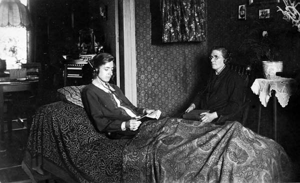 Een zieke vrouw en haar oppas luisteren naar de kerktelefoon. Deze foto toont een van de eerste proefuitzendingen in Maassluis, in 1925.