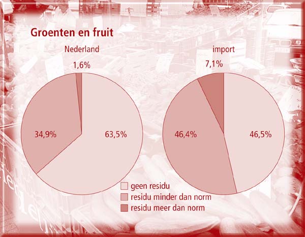 | In een klein deel van de groenten en het fruit worden te veel residuen van bestrijdingsmiddelen aangetroffen. In 1997 bedroeg dat 1,6 procent voor Nederlandse producten en 7,1 procent voor geïmporteerde producten. In het grootste deel van de producten zijn bestrijdingsmiddelen niet of nauwelijks aantoonbaar.