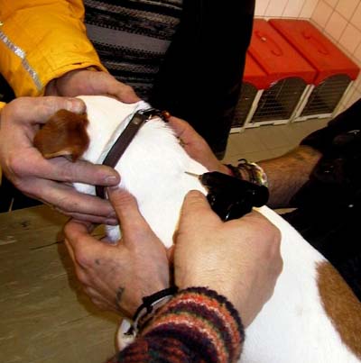 | Het dierenopvangcentrum in Rotterdam hield zaterdag een actie om huisdieren te voorzien van een chip. Er werden ongeveer vijftig honden en vooral katten van een elektronisch levensnummer voorzien. Een eigenaar was die morgen zijn hond kwijtgeraakt. Toen hij hem terugvond, besloot hij het dier maar meteen te laten chippen. De chip is zo klein als een rijstkorrel en het inbrengen voelt het dier nauwelijks. Gezien de belangstelling is het centrum van plan deze actie dit jaar nog enkele malen te herhalen.