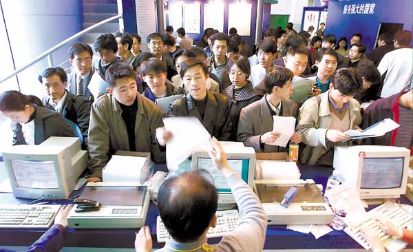 Chinezen, van wie het merendeel jongeren, staan in Peking in de rij om een aanvraag voor internet in te dienen. De foto werd vorig jaar gemaakt tijdens een beurs over elektronische media in de Chinese hoofdstad.