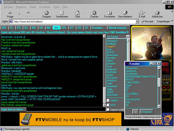 | Chatten is een populaire vorm van communiceren, vooral bij jongeren. Bezoekers van een chatbox kunnen in kleine groepjes, ieder voor zich op zijn eigen pc, met elkaar 'praten' doordat ze de boodschap die een van hen intikt, regel voor regel zien verschijnen op hun scherm. Zinnige gesprekken zijn zeldzaam. Seks is het meest besproken onderwerp. TMF, een van de grootste chatsites van Nederland, trekt al gauw 200.000 bezoekers per week. |