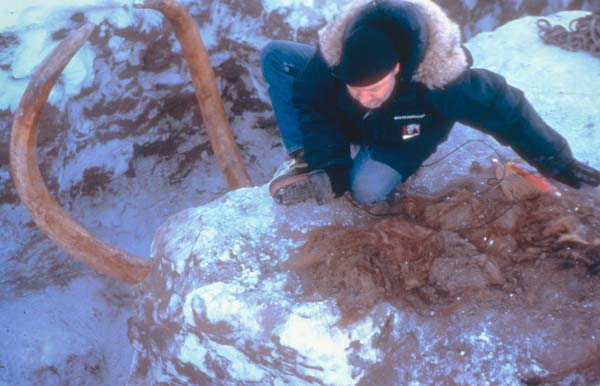 Twee al vrij geprepareerde slagtanden van een mammoet steken uit de Russische permafrostbodem.