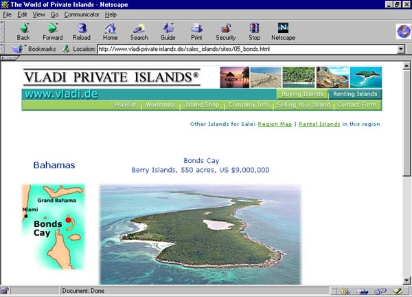 Een Duitse firma biedt op het world wide web stukken land te koop aan. Op de website staan meer dan 600 eilanden tot in detail beschreven. Zelfs luchtfoto's ontbreken niet.