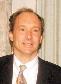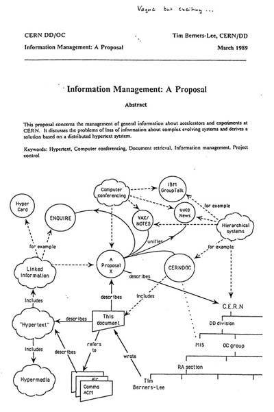 | Tim Berners-Lee (l.) en Robert Cailliau (r.) zijn de grondleggers van het world wide web. Op de foto eronder zijn ze in gesprek met Ted Nelson, de bedenker van de hyperlinks. Onder: het eerste voorstel voor het world wide web, van Tim Berners-Lee, in maart 1989. Berners-Lee had nog geen naam bedacht; midden in de figuur staat: A Proposal X. De baas van Berners-Lee krabbelde bovenaan: Vague but exciting... |