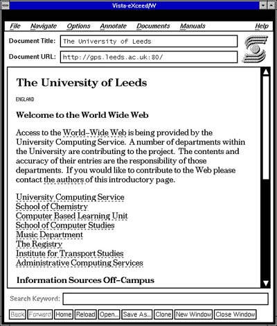| Het world wide web is enorm gegroeid dankzij de Mosaic-browser, die in januari 1993 beschikbaar kwam. Er waren toen vijftig servers en 1 miljoen websites; door Mosaic groeide het web in 1994 met 341.634 procent. Het programma was zeer eenvoudig te installeren en was het eerste waarmee plaatjes zomaar tussen de tekst geplakt konden worden. Boven een oude pagina van de University of Leeds, in een Mosaic-browser; onder de homepage van het National Center for Supercomputing Applications (NCSA) van de Universiteit van Illinois, waar Mosaic is ontwikkeld. De bedenkers van Mosaic bouwden later Netscape. |