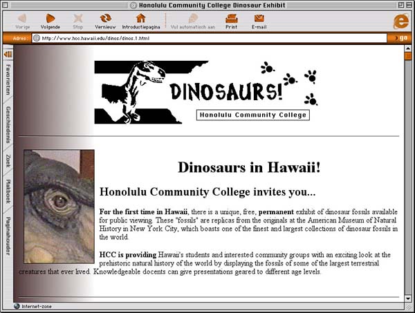 | Een van de oudste webpagina's die nog steeds bestaan, is die over een dinosaurustentoonstelling in Hawaï. De site werd eind mei 1993 geopend. Na 105 dagen waren de pagina's 135.000 keer bekeken. Bezoekers van de website konden de plaatjes vergroten en een gesproken uitleg horen. Een demonstratie van de site haalde de Europese Unie over om subsidie te verlenen aan het web. |