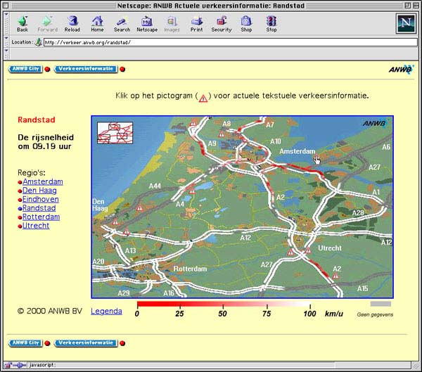 | Een moderne website als die van de ANWB biedt actuele informatie. Het kaartje laat de gemiddelde rijsnelheid zien op snelwegen in de Randstad: op de rode gedeeltes staan files. Tussen het moment dat de snelheid wordt gemeten en het moment dat de informatie op het scherm staat, liggen drie tot vier minuten. |