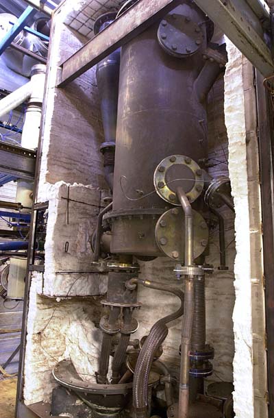![]() | Het trechtervormige vat onder in de foto is het hart van de roterende conusreactor. Daar heeft de omzetting van houtsnippers in pyrolysedampen plaats. De damp wordt door afkoeling omgezet in bio-olie. Een hoeveelheid van 100 kilogram hout levert 75 kilogram bio-olie op.