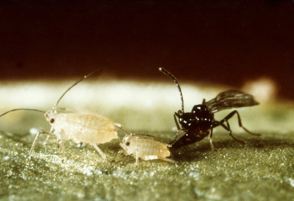 | Een sluipwesp (Aphidius matricariae) legt haar ei in een bladluis. Planten verdedigen zich tegen vraatlustige insecten door geurstoffen aan te maken die roofinsecten zoals de sluipwesp aantrekken. Inzicht in afweermechansmen van planten is van belang voor de bestrijding van insectenplagen en infectieziekten.