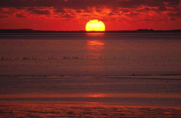 Zonsondergang op het Naardermeer. De aanleg van een tunnel bedreigt Nederlands oudste natuurmonument. Door continue bemaling van het tracé dreigt het Naardermeer leeg te lopen.