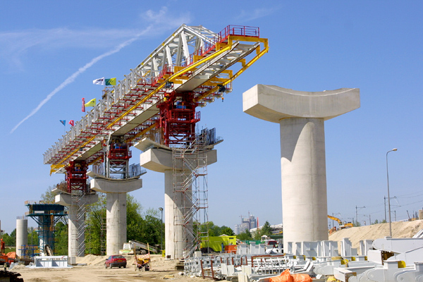| Een verplaatsbare stalen brug met een in- en uitklapbare vloer bouwt de komende jaren de vele horizontale viaductdelen van de Utrechtboog. Ze heet zwevend, maar de 140 meter lange en 1400 ton wegende stellage rust telkens op drie van de enorme kolommen waartussen zij, hoog in de lucht, de brugdelen bouwt.