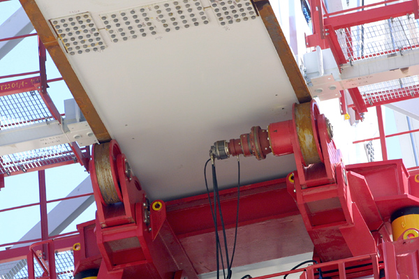 Is het beton eenmaal uitgehard, dan maakt de bekisting zich hydraulisch los en begint de reis van de betonfabriek richting de volgende twee kolommen.
