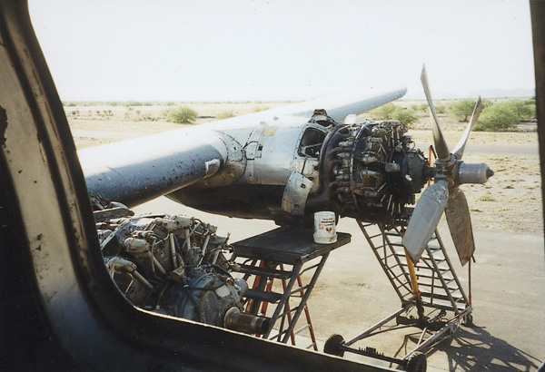 Motor 1 wordt getest met een vierbladige propeller. Standaard zijn de vier motoren van de Connie met driebladige propellers uitgerust.