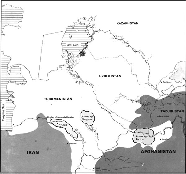Het gebied waar de archeoloog Hiebert zijn ontdekking deed. Links ligt Anau, in het midden het Margianagebied en in Noord-Afghanistan ligt Bactria.