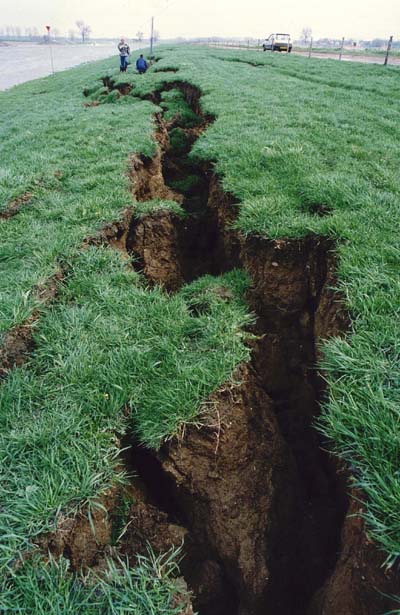 ![]() | In 1992 leidde een aardschok met een kracht van 5,8 bij Roermond tot een schadepost van meer dan 200 miljoen gulden. Dergelijke zware bevingen komen volgens het KNMI in Nederland niet vaker dan eens in de 1000 jaar voor. Op de foto aardscheuren langs de Maasoever bij Roermond.