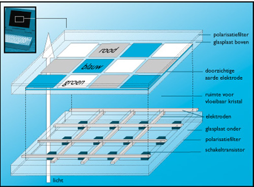 Schematische doorsnee van een lcd-scherm. Elk vakje is een beeldpunt, het licht passeert een vloeibaar kristal dat ingeklemd is tussen twee glasplaten. In de illustratie zijn de glasplaten van elkaar getild.