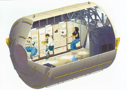 Een model van het Europese ruimtelaboratorium Columbus. Het lab is op de grote foto de horizontale en meest linkse cilindervorm.