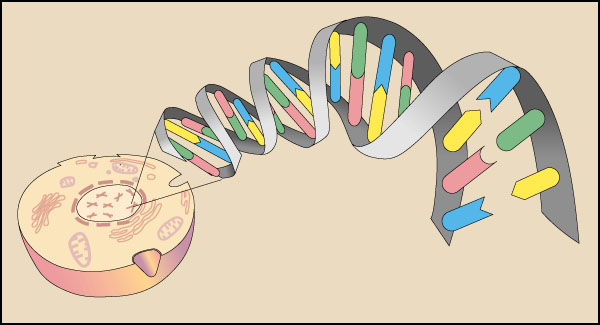 | Cellen zijn de bouwstenen van alle levende wezens. Ze bevatten een celkern met daarin chromosomen. Daarop ligt de erfelijke informatie in de vorm van genen. Elk chromosoom is opgebouwd uit een lang molecuul, het DNA. Twee DNA-strengen zijn als een wenteltrap om elkaar heengedraaid. Twee DNA-bouwstenen die tegengesteld zijn aan elkaar vormen de 'treden' van die trap.