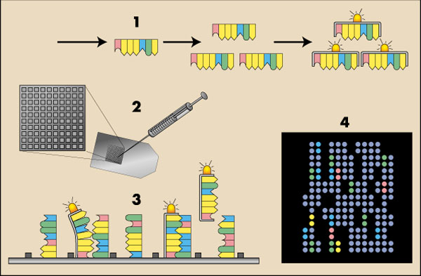 (2) De volgende stap is het opbrengen van dit testmateriaal op een DNA-chip. De chip bevat duizenden vakjes, met in elk vakje miljoenen identieke stukjes DNA met een bekende bouwsteenvolgorde.
