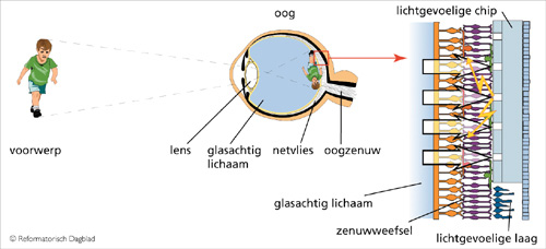 | Duitse onderzoekers werken aan een chip die kan dienen als kunstnetvlies om sommige vormen van blindheid te genezen. De chip vervangt de beschadigde lichtgevoelige cellen en geeft het signaal door aan de hersenen.