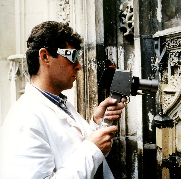 | Deze 'camera' is net een magische wisser. Uit het apparaat komen laserstralen die het zwarte vuil op de gevel van het monumentale gebouw oplossen als sneeuw voor de zon. Als het oppervlak schoon is, wordt het laserlicht teruggekaatst zodat er geen beschadiging van het steen optreedt.