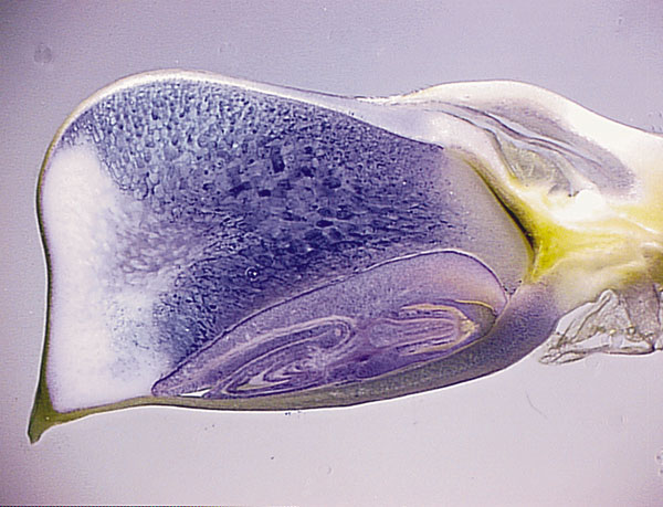 | De blauwe kleur in deze 'doorsnede' van een maïskorrel (19 dagen na de bloei) laat zien op welke plaats zetmeel gemaakt wordt. Links op de foto (de bovenkant van de korrel) is al volop zetmeel aanwezig, aan de basis moet de aanmaak nog beginnen. Onder in het zaad is het embryo te zien, met links de spruit en rechts het worteltje. Rechts op de foto de navelstreng naar de kolf van de maïsplant.