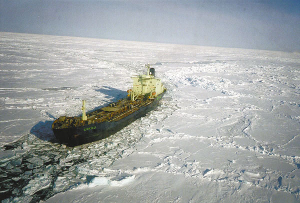 | De Finse tanker Uikku baant zich een weg door de bevroren Noordelijke IJszee. Het schip maakte deel uit van de Arcdev-expeditie, die onderzoek deed naar mogelijk zeetransport vanuit Siberië naar het Westen. De dubbelwandige tanker is uitgerust met een ijsbrekersteven om zich een weg te banen door het ijs. Tijdens de expeditie werd het schip vergezeld van Russische ijsbrekers voor het zware werk.