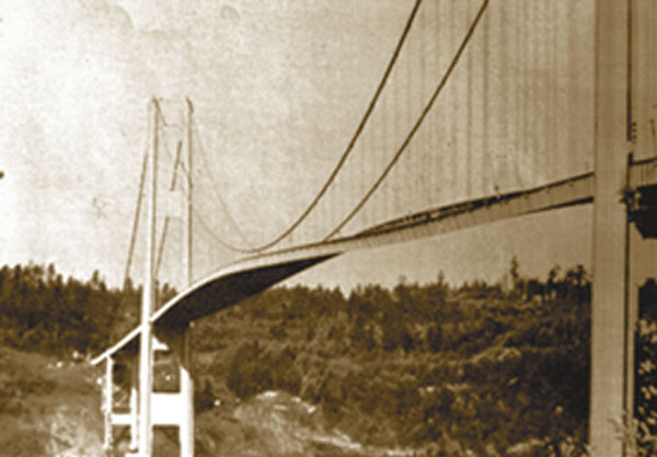 | Op 7 juli 1940 stortte de Tacoma Narrows Bridge in, 129 dagen na de opening. De brug begon bij een windsnelheid van 68 kilometer per uur enorm te trillen, en brak. Na de ramp zijn constructeurs het verschijnsel eigenfrequentie grondig gaan bestuderen.