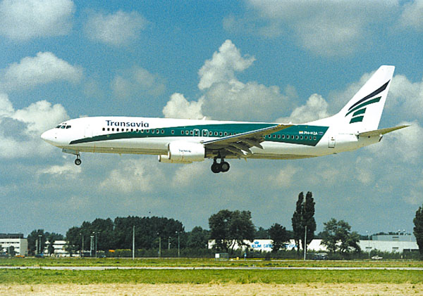 De nieuwe Boeing 737-800 van Transavia, bij de eerste landing op de thuisbasis.