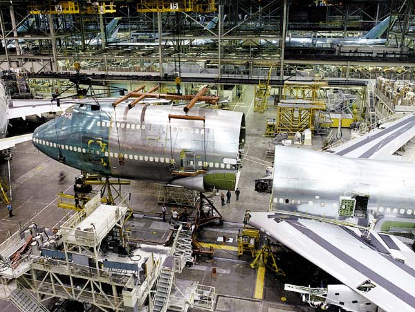 In de grootste fabriekshal ter wereld 30 meter hoog en een vloeroppervlak van 40 hectare maakt Boeing al dertig jaar het grootste toestel uit de burgerluchtvaart, de 747.