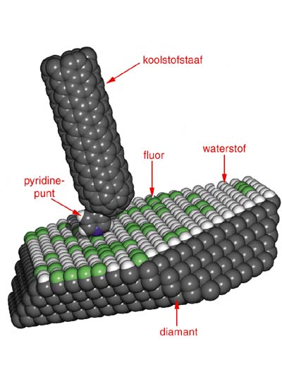 Het 'beschrijven' van het diamanten oppervlak is moeilijk. De diamant is bedekt met een laag waterstof. Het is technisch mogelijk om gericht individuele waterstofatomen weg te schieten uit zo'n oppervlak. Dat moet gebeuren in aanwezigheid van een gas, waardoor fluoratomen de lege plaatsen innemen. Die laatste fase kan nu alleen nog maar in theorie.