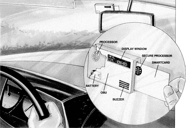 De On Board Unit (OBU) met bijbehorende chipcard. De OBU, ter waarde van ongeveer 100 gulden, exclusief het tegoed op de chipcard, zit in een raamhouder op de plaats waar vroeger het kentekenbewijs deel III zat.