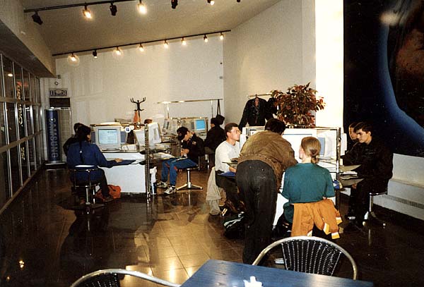 De computers in het Moskouse Internet-café Virtual World zijn bijna permanent bezet. De jongelui houden zich vooral bezig met chatten, babbelen via Internet.