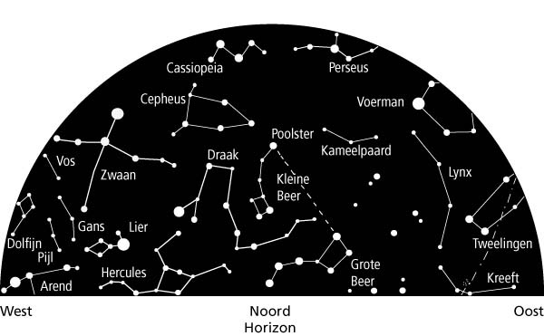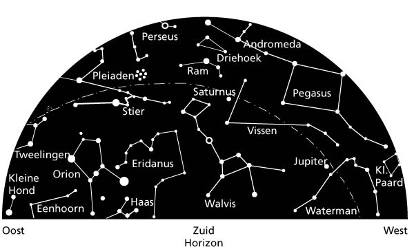 De kaartjes tonen de sterrenhemel op 1 november om elf uur 's avonds. De stippellijn is de ecliptica, de schijnbare baan die de zon bij haar omloop door de sterrenbeelden lijkt te maken. De maanbaan staat 5 graden schuin op deze baan.