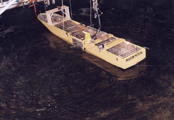 | Het Wageningse maritiem onderzoeksinstituut Marin onderzoekt de 'Noordzeewaardigheid' van een roll-on-roll-off-veerboot. In de zijwand van het schip is een 'beschadiging' aangebracht, maar ondanks de golfslag van 4 meter hoogte blijft het schip stabiel.