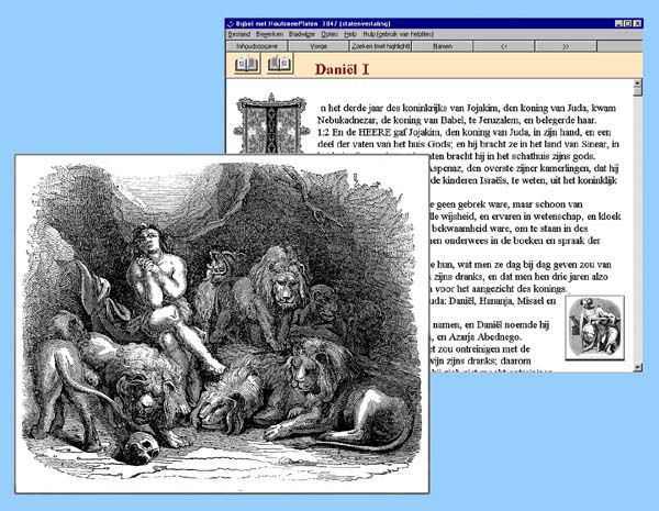 De Prentenbijbel op cd-rom bevat honderden houtgravures. Veelal zijn het bewerkingen van schilderijen, zoals bij Daniël in den Leeuvvenkuil van Petrus Paulus Rubens (1577-1640).