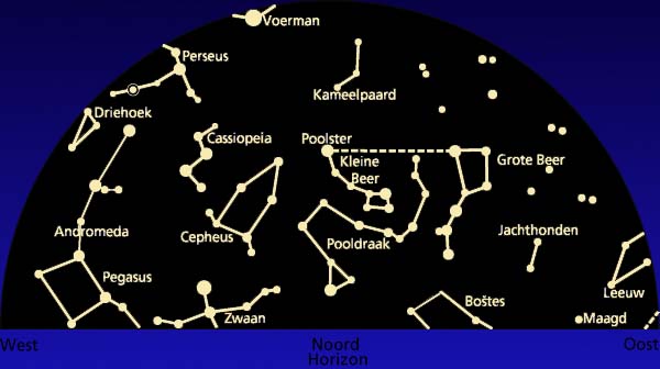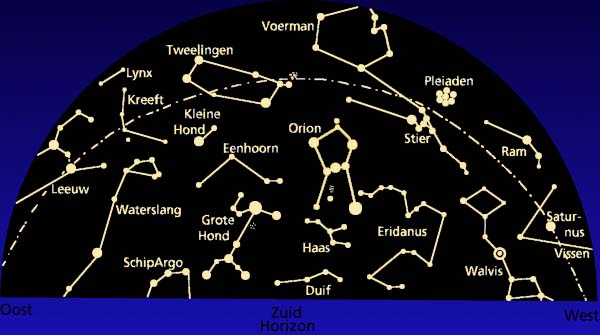 De kaartjes tonen de hemelkoepel boven Nederland op 1 december rond 2.00 uur en op 15 december om 24.00 uur. Alleen de planeet Saturnus is op de tweede datum al weer wat verder gelopen.
