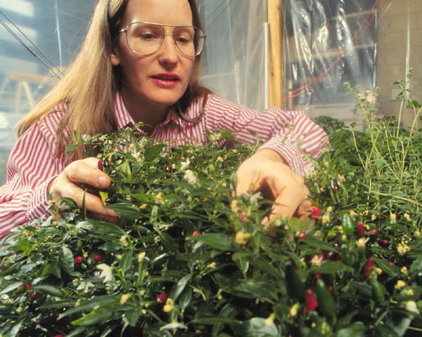 Prof. J. Hunter koestert een van haar paprikaplantjes. Ze onderzocht hoe astronauten zo efficiënt mogelijk gewassen kunnen verbouwen op een andere planeet.