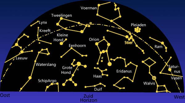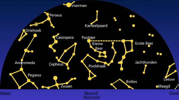 De sterrenhemel boven Nederland voor begin januari om 23.00 uur en voor de tweede helft van de maand voor circa 21.00 uur.