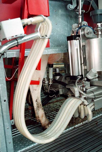 De Lely Astronaut herkent de spenen van de koe via een ronddraaiende laserbron, vlak naast de witte melkbekers.