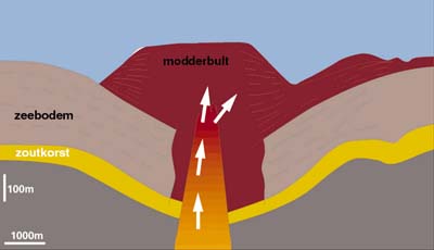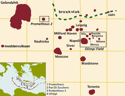 Dwarsdoorsnede van de moddervulkaan Napoli op de bodem van de Middellandse Zee ten zuiden van het Griekse eiland Kreta. De pijlen stellen de stroom modder, gas en zout voor. In het gebied (onder) komen duizenden moddervulkanen voor. Het rechter omlijnde blok op de uitvergrote kaart is het onderzoeksgebied van de expeditie.
