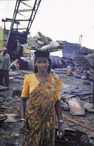 Een Indiase vrouw draagt een portie asbest naar de dichtstbijzijnde verkoopplek.