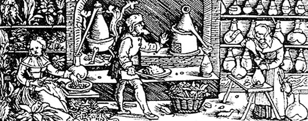 | In de twaalfde eeuw destilleert een Arabische geleerde alcohol uit wijn. Enkele eeuwen later gaan kloosters en apotheken het destillatieproces gebruiken voor de bereiding van kruidenaftreksels. Deze afbeelding toont drie stadia in de bereiding van zulke 'gedestilleerde wateren': de selectie van de plantendelen, de destillatie en het vullen van de flessen. |