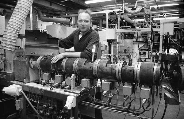 | Ir. M. H. B. Snijder van het Wageningse ATO-DLO werkt aan het mengen van vezels uit landbouwgewassen met plastics, in zogenaamde extruders. Een composiet van stro en gerecycled plastic levert een product dat sterker is dan veel hardhoutsoorten. Snijder toont een deurbekleding voor een autoportier, gemaakt uit houtvezels en kunststof.