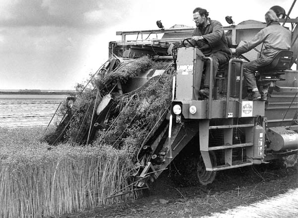 | Een vlasboer oogst zijn gewas. De stengels blijven achter op de akker, na enkele weken dauwroten zijn ze geschikt voor de verwerking tot linnen. Vlasvezels kunnen ook dienen om kunststoffen te verstevigen, als alternatief voor glasvezels.