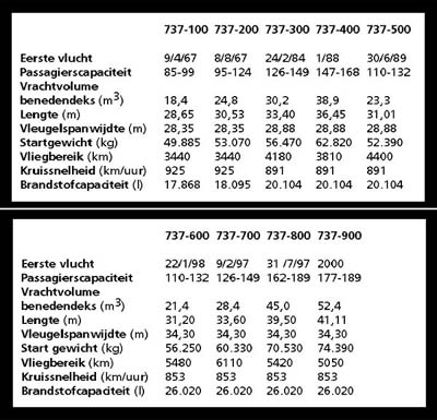 Specificaties van de Boeing 737. De bovenste tabel geeft cijfers over de klassieke Boeing 737, de onderste over de nieuwe generatie 737.