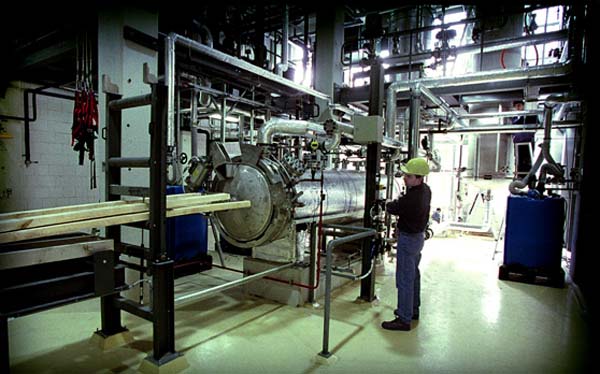 | Op het Arnhemse industrieterrein Kleefse Waard start deze week een proeffabriek voor het chemisch verduurzamen van hout. Het zachthout ondergaat in de ketel op de voorgrond een behandeling met azijnzuuranhydride, die het hout waterafstotend maakt.