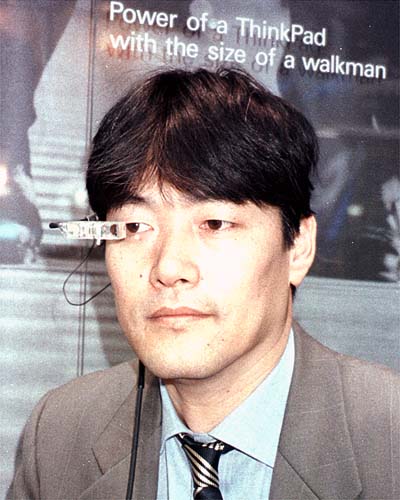 Een computerscherm met een hoogte van 1 centimeter hangt voor het rechteroog van IBM-productmanager T. Hatta. Het scherm is onderdeel van de Wearable PC, een volwaardige pc met een gewicht van slechts 300 gram.