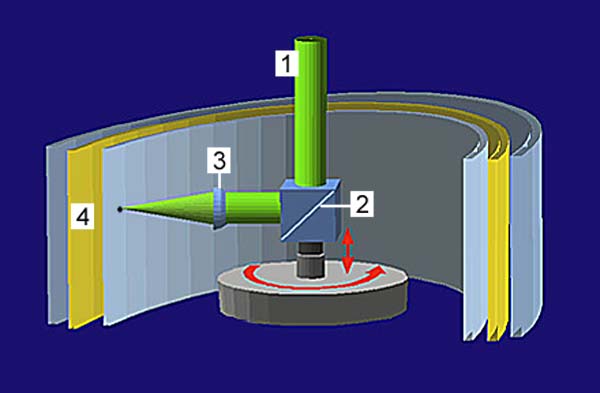 Om te kunnen schrijven in het plakband draait een spiegel (2) rond in het centrum van het rolletje. De spiegel stuurt de laserstraal (1) naar een lens (3) die de lichtbundel scherp stelt op een van de lagen tape (4).